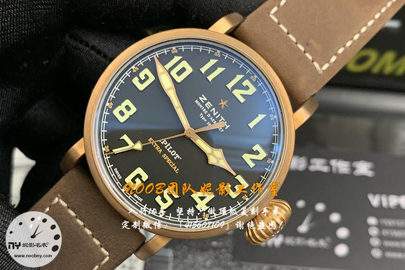 大家好,首先祝大家新年快乐,今天分享的腕表则是来自xf厂真力时青铜大飞,对于这款腕表来说,也是很多表友比较中意的款式,整体腕表硬汉感加上独有的青铜材质,也是得到了各界表友的一致好评,标志性的洋葱把头,也是整体腕表最具有标志性的细节,就如沛纳海护桥一样,都是具有品牌意义,当然也是有很多表友直接称腕表为洋葱把头,整体把头非常具有美感,同时纹理也是非常清晰,硕大的把头也非常适合调试时间,同时把头为嵌入式把头,也非常具有强大的防水力度,当然在调试好时间后,一定的锁住把头。整体真力时大飞镜面为蓝宝石镜面,同时镜面的通透性也是非常强,具有耐刮性,但是腕表在后期还是得爱惜,以免镜面受损,同时整体字面采用数字刻度,钛金属材质的指针,拉丝处理,质感满满,同时覆有淡棕色夜光涂层,黑色镀钌和琢面指针与覆以淡棕色超级夜光涂层阿拉伯数字时标相互映衬,在较暗的环境下也能够保障清晰直观的读时,非常便利,同时夜光也是非常强,同时中意的表友也是可以大胆考虑,也可以直接与妮影工作室交流!(415607109)