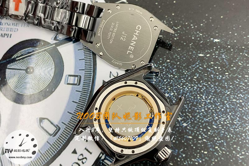 KOR香奈儿J12后盖赏析:腕表采用陶瓷,同时表背为精钢材质,有“CHANEL”和“J12”字样,表底以8枚螺钉加以固定。内中搭载高精密度进口石英机芯,走时精准稳定,让女性表友可以更加放心佩戴,完全不需担忧返修问题。同时整体腕表采用旋入式把头设计,防水效果很好,但是一定得把把头转稳!同时搭配高密度陶瓷表带,折叠扣的设计也让整体腕表佩戴起来非常的舒适!