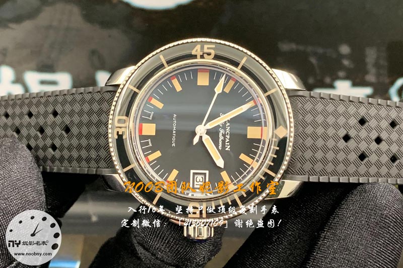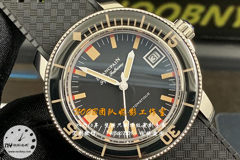 ZF厂宝珀五十寻梭子鱼的字面设计非常独特,采用了经典的样式。这种设计不仅美观大方,而且极富立体感。ZF厂这次指针做的十分干净,还是很优秀的,时标刻度边缘也没有多余的毛边,字体都是同步原版风格。同时,时、分、秒的显示也非常清晰易读。值得一提的是,表盘上的夜光涂层非常均匀,即使在黑暗环境下也能清晰读取时间,当然对于腕表圈口也是属于夜光细节,这也是很为动人的一个细节点!