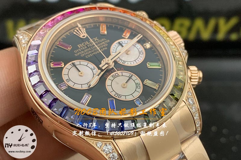 大家好,今天分享一款来土豪版劳力士迪通拿,对于复刻表迪通拿来说,大家首先想到的则为N厂手表,这里有一个误区,并不是所有的迪通拿都是N厂在做,当然也不止N厂做得好,之前大家都比较有误解说N的迪通拿是最好的,今天我们要说的是BL厂的彩虹迪,确实目前市场做得比较好的彩虹迪就是BL厂了,由BL工厂独家开模,主要有下面各种型号:白色版116599RBOW,金色版116598RBOW,玫瑰金版116595RBOW。彩虹迪通拿是非常的难抢!镶嵌都是根据原版出厂颜色渐变过渡最协调的36颗宝石进行优化处理,各个细节都是保持一致,由于这个彩虹迪本身就是超级有难度,所以工厂也非常用心做好这些细节,折射效果非常漂亮。字面每个计时盘为光线的不同而发生折射,色泽鲜艳亮丽,十分独特。搭载7750机械计时机芯,蓝宝石透彻效果镜面,钢实心链节蚝式易调节表带,抛光打磨精湛细腻,同时也是目前做工最好的彩虹迪通拿,今天妮影工作室介绍的这款腕表,可以说是劳力士的顶级表款,让人望而生畏——它就是BL厂劳力士彩虹迪通拿。