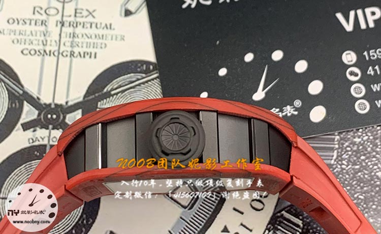 首先,从尺寸上来看,YS厂的RM52真陀飞轮复刻表版本几乎与官方细节一致。长宽厚的细微差距几乎可以忽略不计,这使得整款腕表在佩戴时能够完美贴合手腕,舒适度极高。而红色碳纤维材质的选用,不仅让腕表看起来更加时尚动感,同时也保证了整体的轻便性,让佩戴者佩戴起来也是很为舒适。