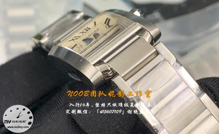 首先映入眼帘的,是这款手表那独特的“一体手镯式”设计。作为TANK系列的核心元素,这一设计在第二代作品中得到了更加精细的打磨。表壳尺寸的微调以及表链链节比例的重新设计,让整体线条更加流畅,佩戴在手腕上更显优雅与利落。大面积的拉丝缎面工艺处理,使得表壳与表链的质感达到了高度统一,呈现出一种浑然天成的美感。平行表耳与弧形表壳的搭配,使得手表在视觉上更加圆润柔和。而表壳上独特的凹槽设计,不仅减轻了表冠顶手的问题,更在视觉上形成了一种简约洗练的美感。这一设计上的巧思,无疑为这款手表增添了不少亮点。
