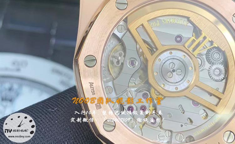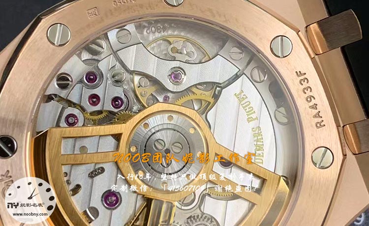 APS 厂爱彼 15500 玫瑰金最大的亮点,莫过于搭载的丹东 4302 无卡度一体机芯—— 这也是这款复刻表能成为行业标杆的核心原因。区别于小厂采用的 “甲板机、装饰齿轮”,APS 厂 4302 机芯为真实可动结构,上链时齿轮联动清晰可见,彻底告别 “一眼假” 的尴尬。机芯夹板采用镀铑处理,色泽均匀,烫金刻字规整清晰,无晕染、模糊问题,宝石轴承颜色鲜艳透亮,背透观感与正品 Cal.4302 机芯高度接近。无卡度摆轮设计是核心升级点,放弃了传统的螺丝固定方式,采用弹簧片结构,摆频达到 28800 次 / 小时,走时稳定性极强,日常佩戴误差可控制在 ±10 秒 / 天内,远超行业平均水平。机芯厚度为 4.9mm,与正品完全一致,保证了表壳整体厚度的合规性,无 “厚壳” 破绽。动力储存约 40 小时,自动上链效率高,日历瞬跳、逆调顺走等功能均完整还原正品,实用性拉满。背透蓝宝石底盖采用螺丝固定,牢固性强,日常使用中定期检查螺丝状态即可避免脱落风险。