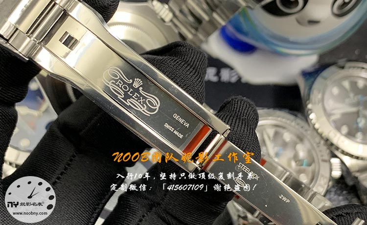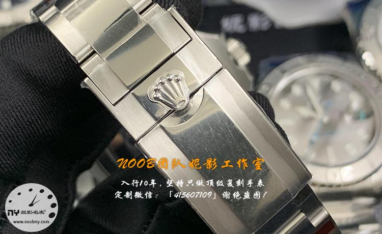 表带采用游艇经典三排链节设计,链节打磨精细、边缘圆润,贴合手腕不硌手,佩戴舒适无异物感;表扣细节完全对标正品,开合流畅、牢固不松垮,表扣上的品牌标识、刻印清晰立体,字体、工艺和原版高度一致,解锁、扣合的手感和正品几乎无差,兼顾佩戴便捷性与耐用性,长期使用不易变形、松动。