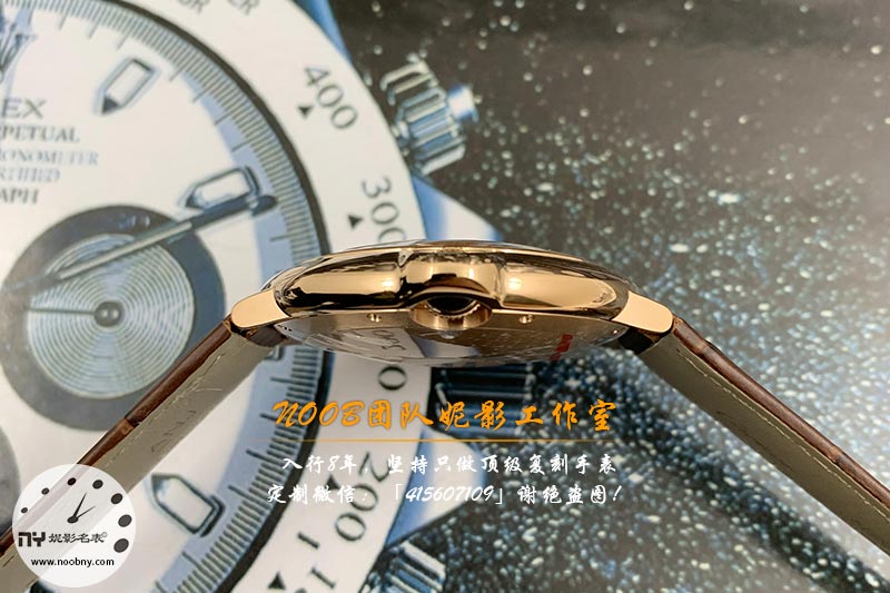 同时对于蓝气球背面,腕表采用密底设计,同时也是属于椭圆的状态,字体的设计也是非常的清晰,同时背面也有加入黑色防水圈,来保证腕表的正常生活防水!整体腕表采用了工厂原配小牛皮,对于皮带而言,个人还是感觉差点意思,在后期还是建议更换为鳄鱼皮,让腕表的更加的接近原版,同时表扣细节也是采用渡金处理的按扣,让腕表在细节上也是符合原版的要求!